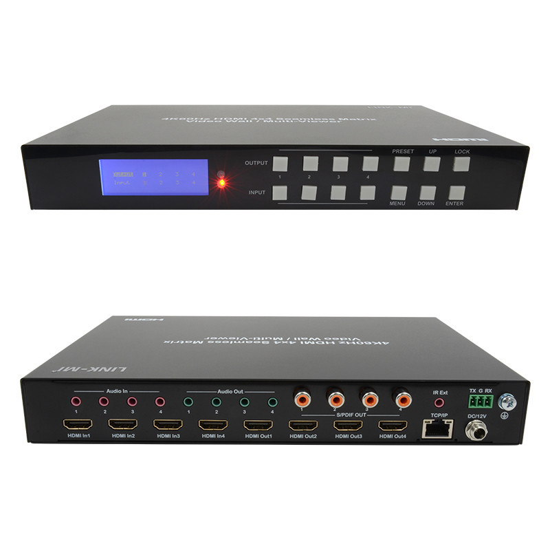O LINK-MI LM-TVM47 é um comutador de matriz de alto desempenho com 4 saídas de comutação e 4 entradas mistas.Ele suporta várias funções de parede de vídeo, tais como 2x2, 4x1... e função de espelho de imagem de saída. Suporta resolução máxima 4K @ 60Hz e vem com extração de áudio analógico. Pode ser controlado através do botão do painel, controle remoto, controle RS232,Controle TCP/IP.